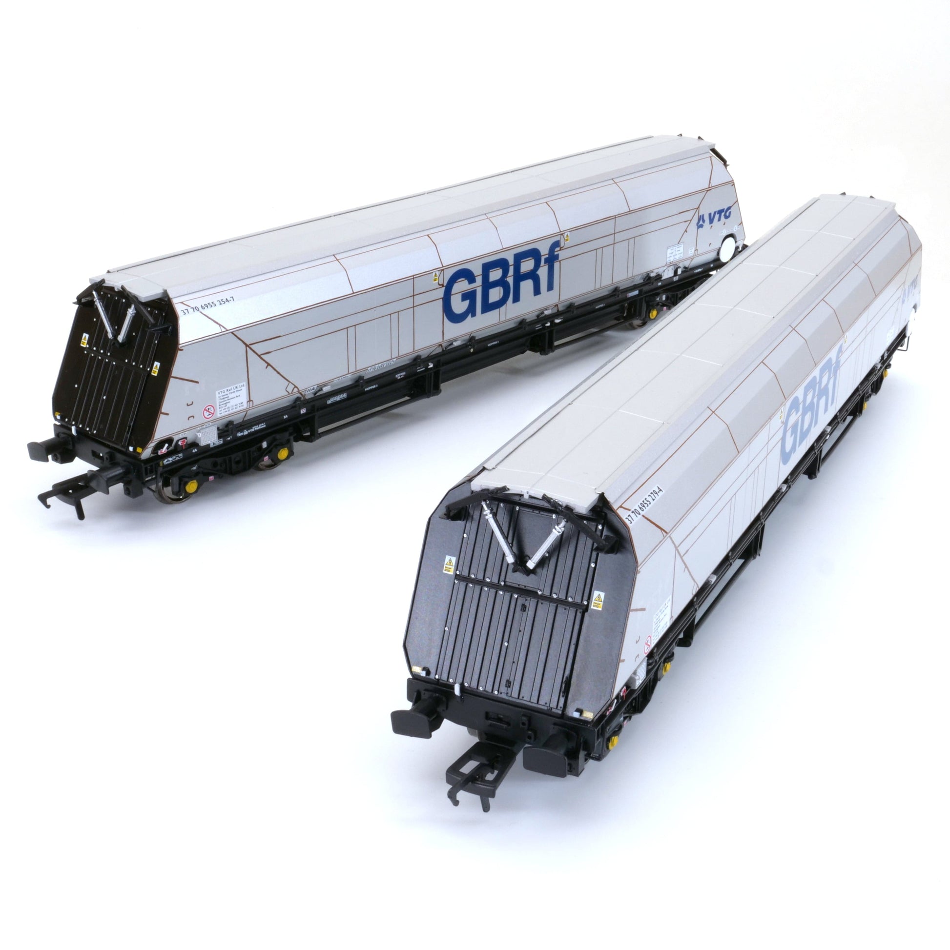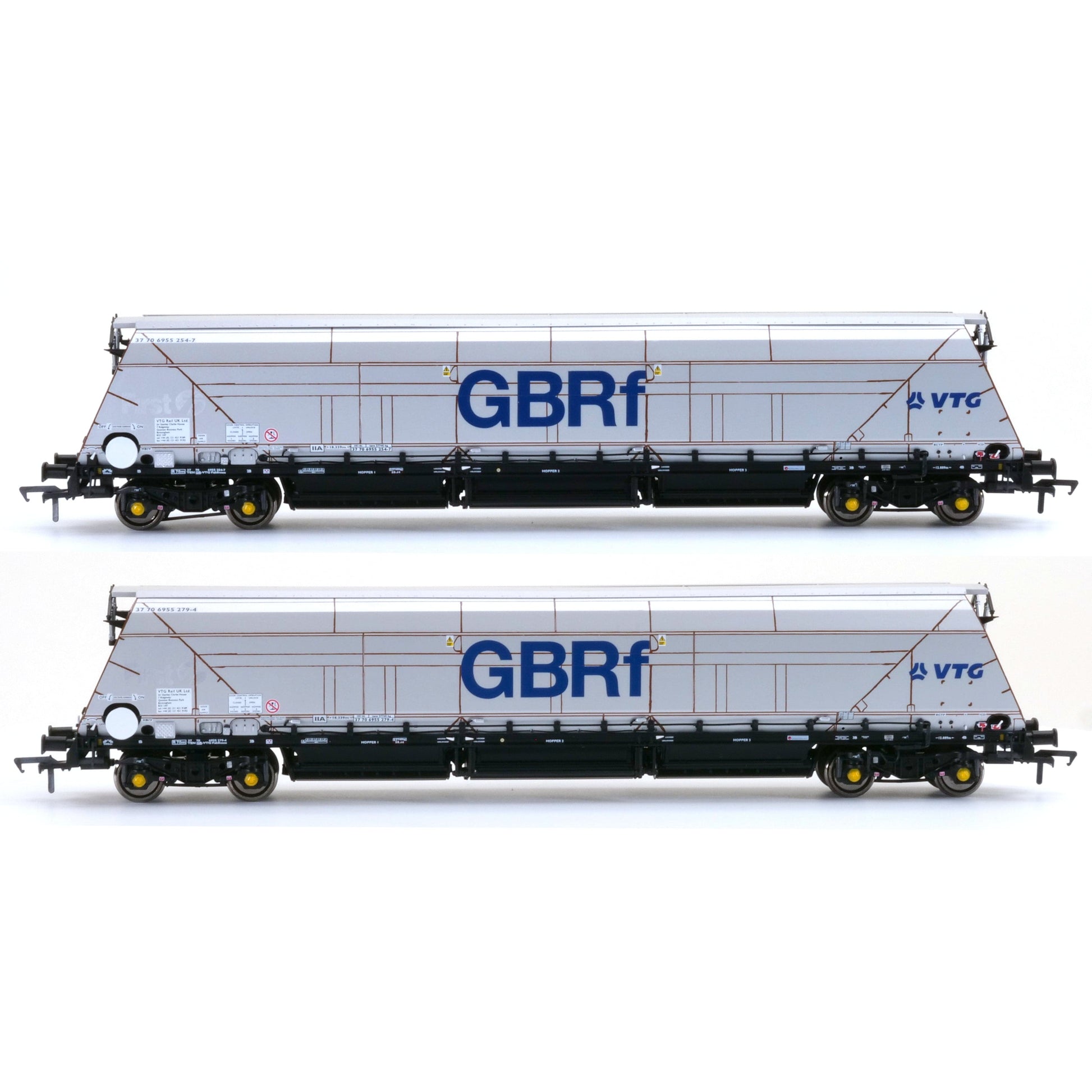 This pack contains two IIA Biomass Bogie Hopper Wagons, 'unpainted' with GBRf and VTG logos - “Ghosted” former First logos