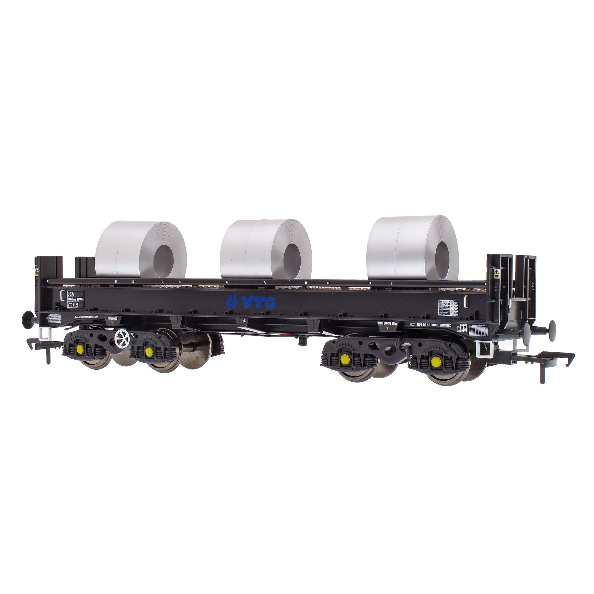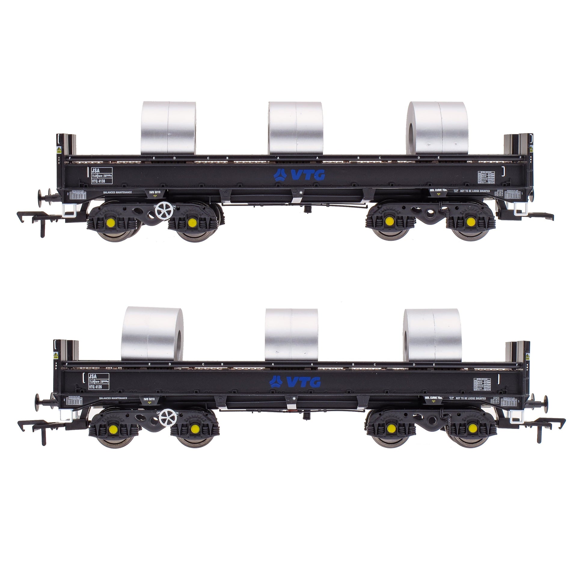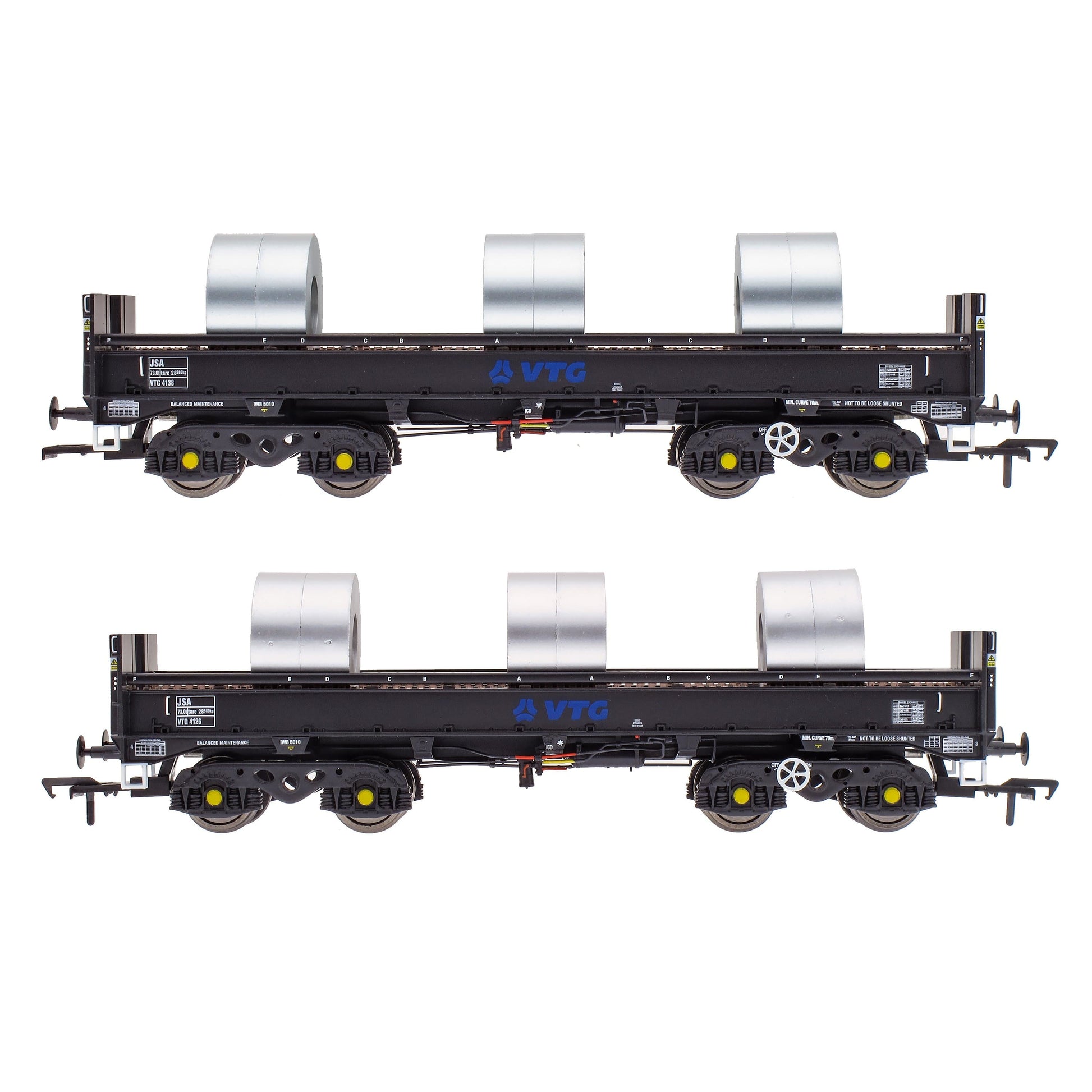 This pack contains two wagons, with three Steel Coil loads on each: