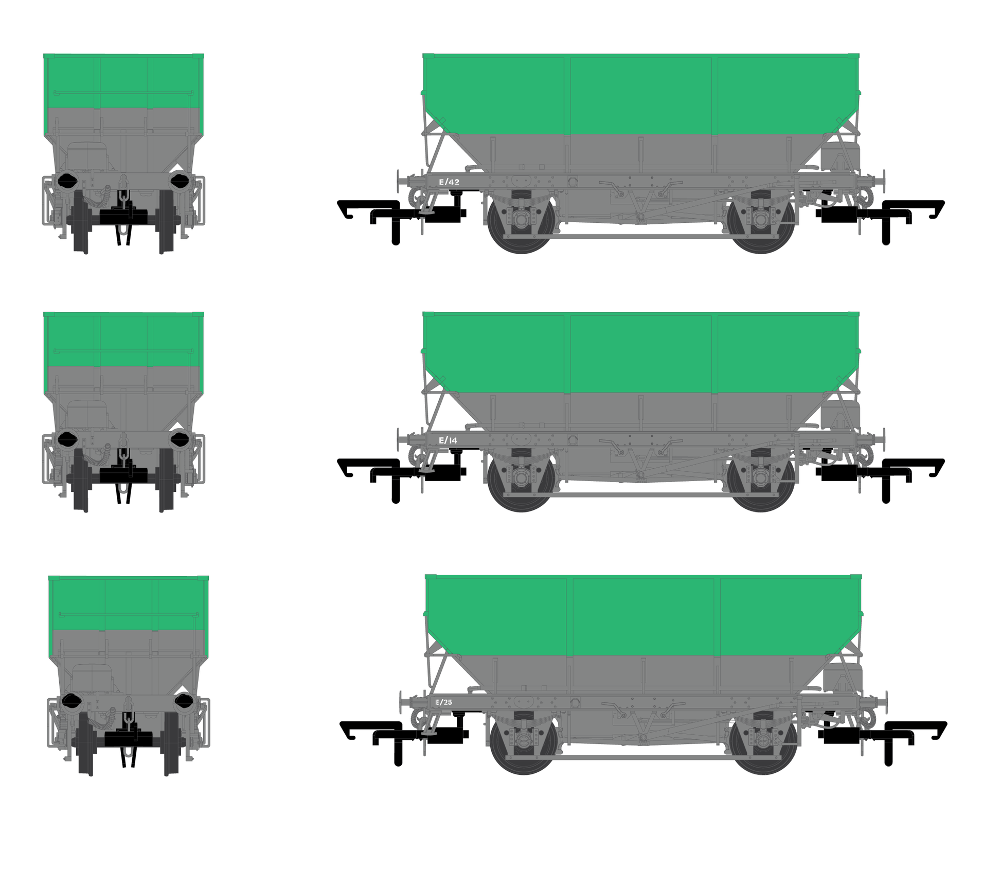 The widespread withdrawal of 21t hoppers from the mainline network led to many being repurposed by BR or sold on to private companies for internal use. One such operator was the National Coal board who had a coal disposal site and washery at Gwaun-Cae-Gurwen, South Wales. The railhead was operated by Powell Duffryn Coal Preparation, and they required a fleet of internal user wagons for the transfer of coal around the site.During the early 1990s this fleet, made up from redundant HTV’s and HEA’s received the striking green and grey livery seen on our models. These wagons would see use right through the decade until the site was mothballed in 1999.